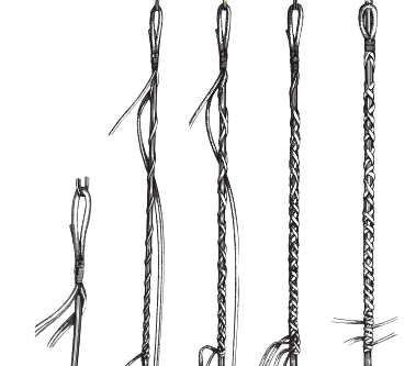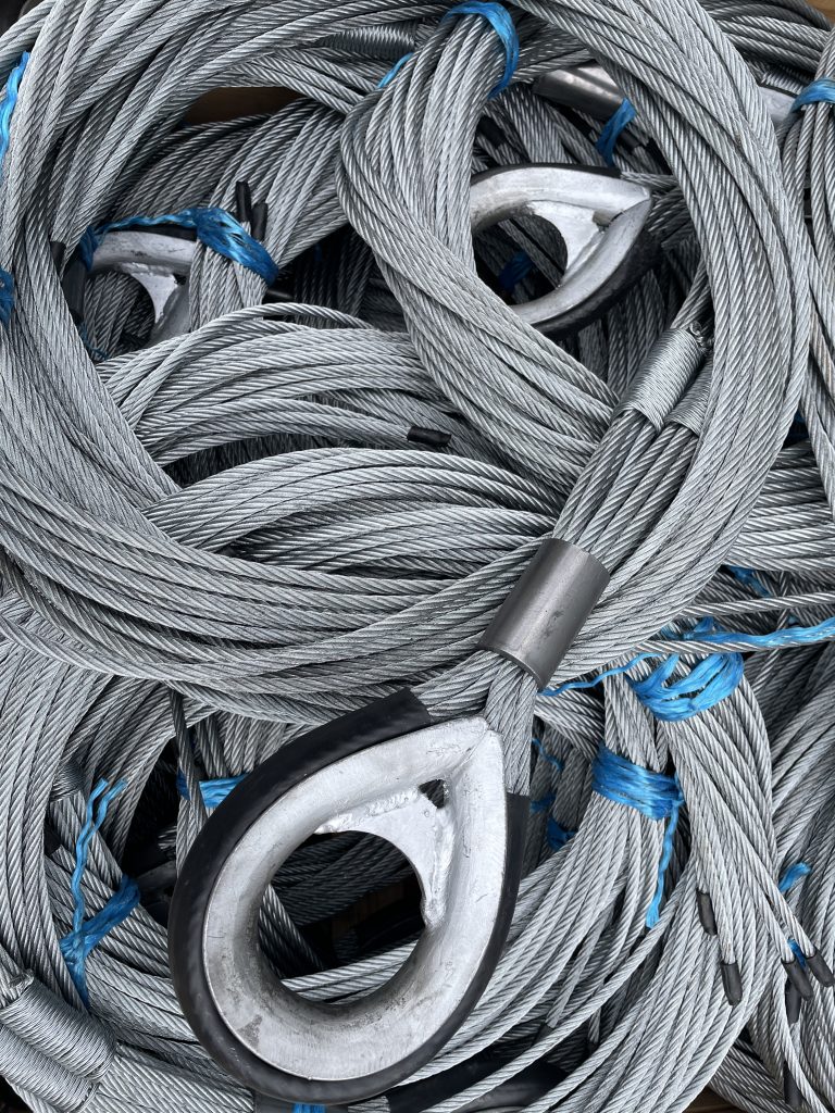 Construction comprises of six lengths of 8mm wire rope (2x6m, 2x8m, 2x10m) wrapped centrally around with a steel Ferrule. Ends being fused and tapered or secured with rubber heat shrink.